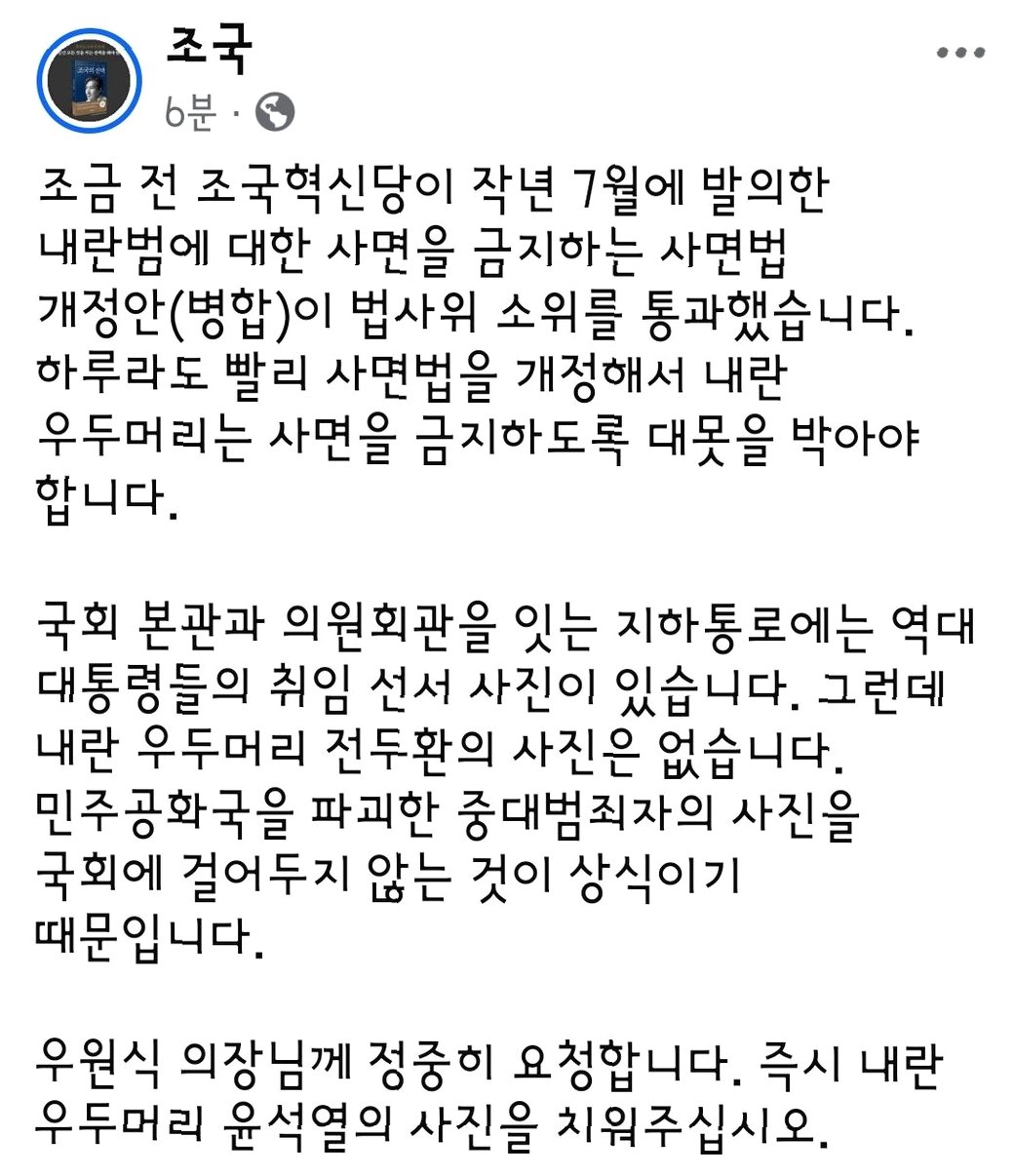 조국 대표는 사면법 개정안 의결 후에도 '하루라도 빨리 사면법을 개정해 내란 우두머리는 사면을 금지하도록 대못을 박아야 한다'며 법 개정의 필요성을 강하게 피력했습니다. 해당 법안은 법사위 전체회의 통과 후 이르면 24일 국회 본회의에 상정될 전망입니다.