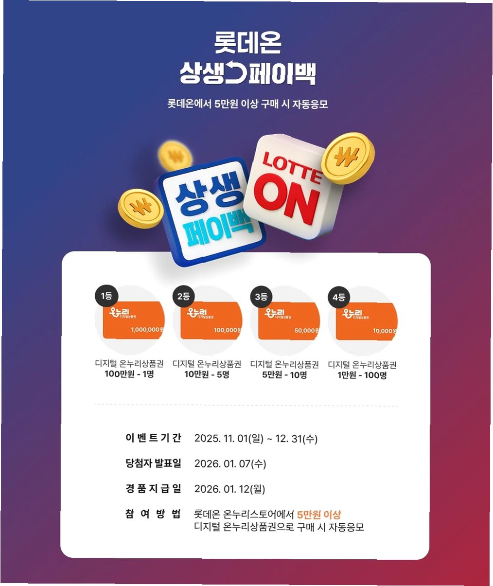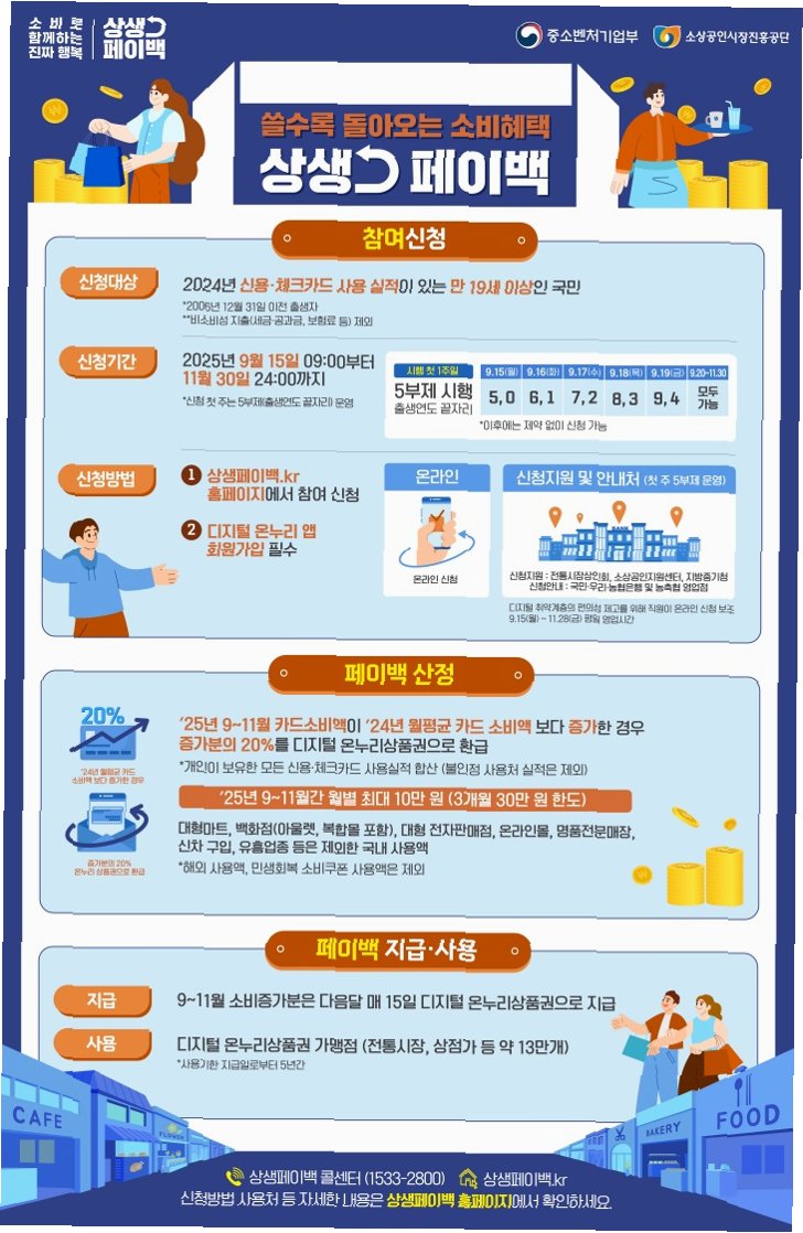 중소벤처기업부가 연말 소비 분위기를 더욱 확산시키기 위해 '상생페이백' 사업을 12월까지 연장한다는 반가운 소식을 전했습니다. 11월 말 종료 예정이었던 상생페이백은, 연중 카드 사용액이 가장 많은 12월을 포함하여 소비 진작에 힘을 보태고자 연장 결정되었습니다. 아직 참여하지 못하신 분들께는 다시 한번 놓칠 수 없는 기회가 찾아온 셈입니다. 이 기회를 통해 소중한 소비의 즐거움을 누리고, 혜택까지 챙겨가세요!