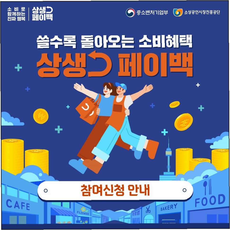 중소벤처기업부가 연말 소비 분위기를 더욱 확산시키기 위해 '상생페이백' 사업을 12월까지 연장한다는 반가운 소식을 전했습니다. 11월 말 종료 예정이었던 상생페이백은, 연중 카드 사용액이 가장 많은 12월을 포함하여 소비 진작에 힘을 보태고자 연장 결정되었습니다. 아직 참여하지 못하신 분들께는 다시 한번 놓칠 수 없는 기회가 찾아온 셈입니다. 이 기회를 통해 소중한 소비의 즐거움을 누리고, 혜택까지 챙겨가세요!