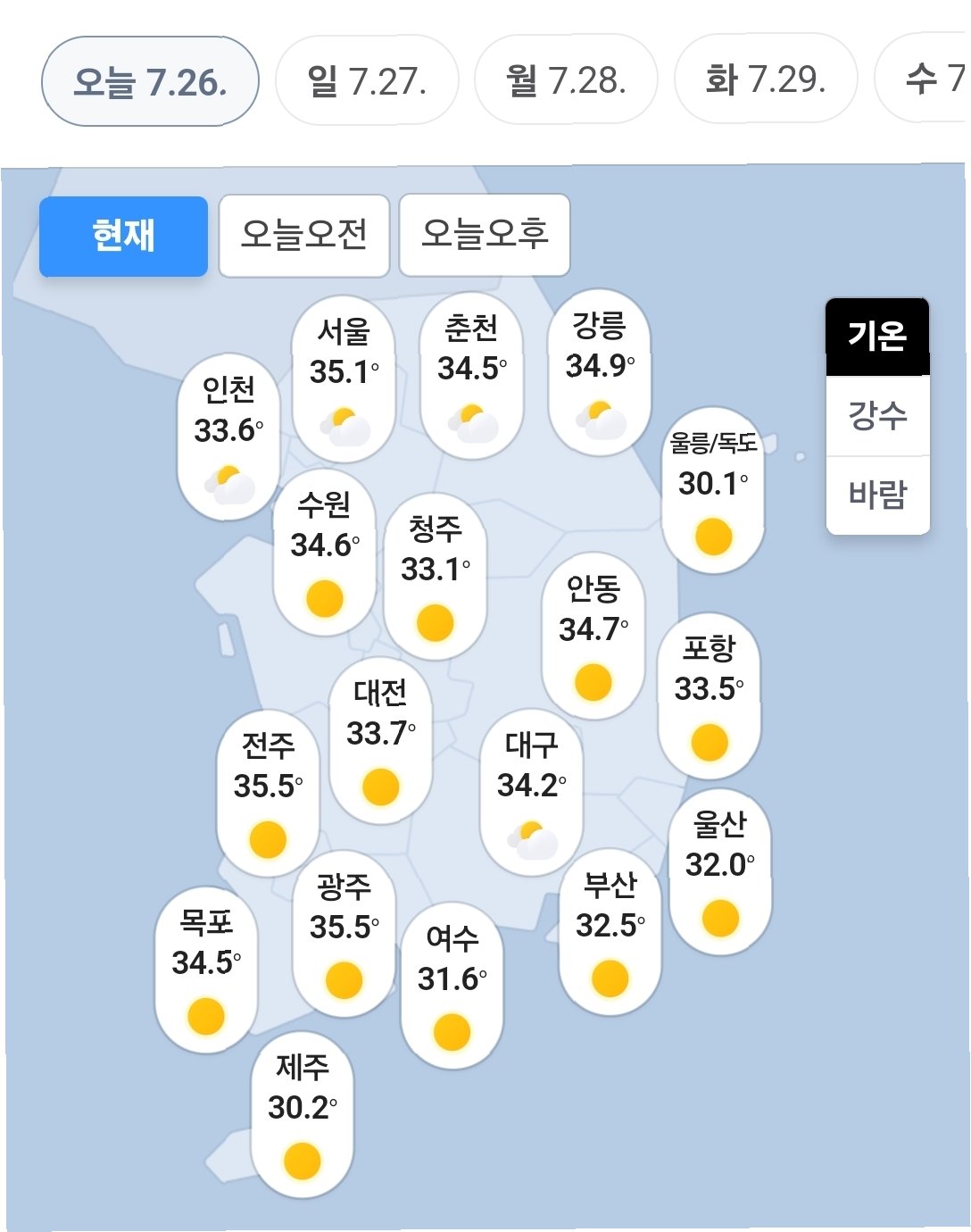 현재 기온 및 낮 기온 전망