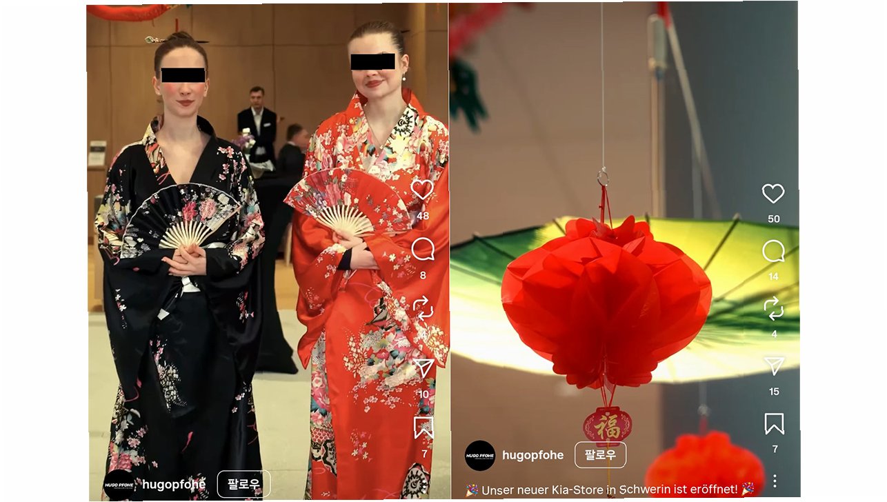 독일 슈베린에 위치한 기아자동차 대리점 오픈 행사에서 일본 전통 의상인 '기모노'가 등장하며 논란이 일고 있습니다. 행사장 분위기는 일본 및 중국풍으로 꾸며졌으나, 영상 설명에는 '한국적인 장식'이라고 표기되어 혼란을 야기했습니다. 이는 한국 문화에 대한 이해 부족에서 비롯된 해프닝으로 보입니다.