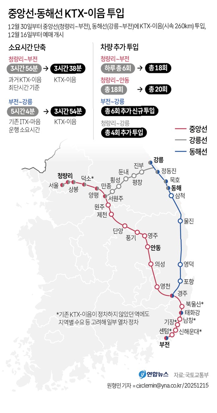 동해선 KTX-이음 투입으로 강릉-부산 이동 시간이 획기적으로 단축! 강원, 경북 지역 접근성 향상 및 관광 활성화 기대! 증편 운행으로 더욱 많은 사람들이 편리하게 이용 가능! KTX-이음, 여행의 새로운 기준을 제시하며 미래를 향해 나아갑니다.