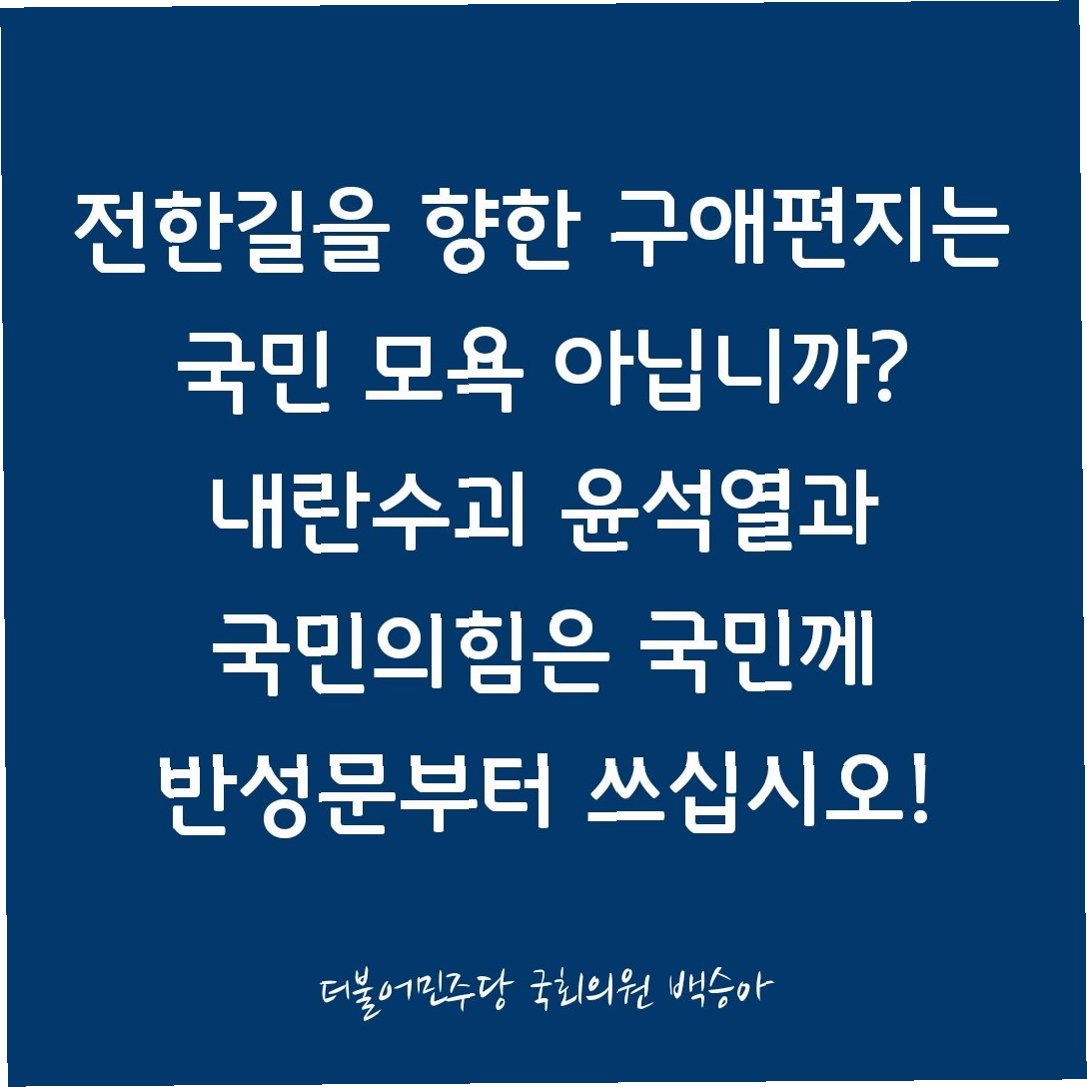 백승아 원내대변인은 현재 수사와 재판을 통해 윤석열·김건희 정권의 국정농단과 내란의 진상이 밝혀지고 있는데도, 국민을 향해 책임 있는 사과와 반성이 없다는 점을 지적했습니다. 그는 '내란수괴 윤석열과 국민의힘은 극우선동이 아니라 국민께 용서를 구하는 반성문부터 써야 하지 않나'라고 꼬집으며, 진정한 반성을 촉구했습니다.