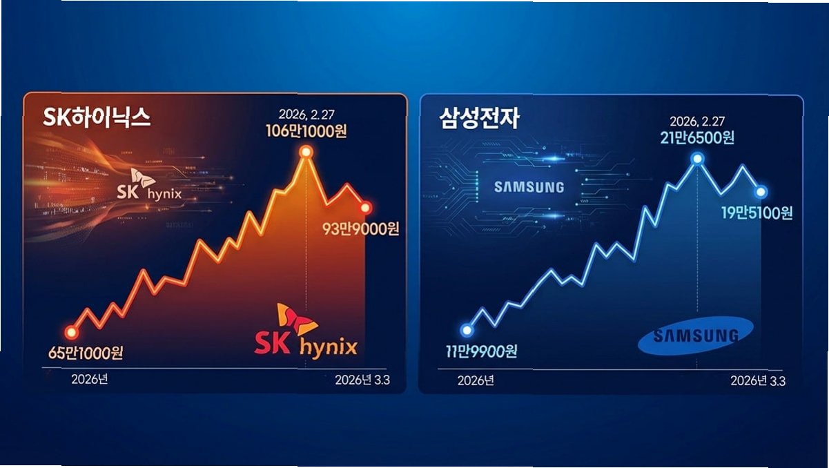 중동 지역의 지정학적 불안감이 고조되면서 국내 증시가 큰 폭으로 하락했습니다. 특히 삼성전자와 SK하이닉스의 주가가 급락하며 '17만전자'와 '90만전자'가 무너졌고, 개인 투자자들의 매수 및 매도 시점에 대한 고민이 깊어지고 있습니다. 전일 삼성전자는 7.81% 하락한 17만3500원에, SK하이닉스는 9.42% 하락한 83만7000원에 장을 마감했습니다. 이는 각각 지난달 12일과 1월 29일 이전 수준으로 돌아간 것입니다.