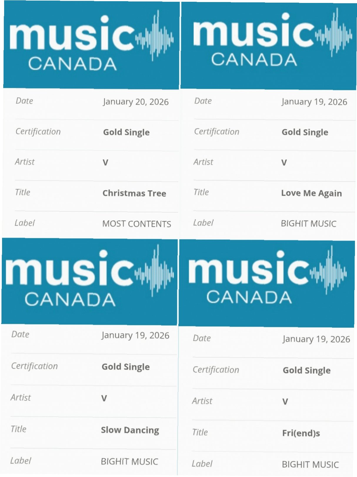 A.캐나다 음반 산업협회 뮤직 캐나다(Music Canada)는 디지털 다운로드와 실물 싱글 판매량을 합산하여 4만 유닛 이상을 기록한 곡에 싱글 부문 골드 인증을 부여합니다.