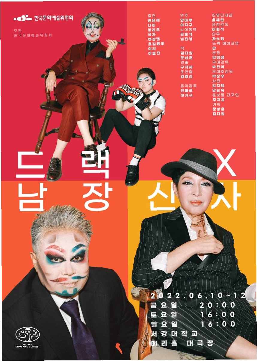 연극 'DRAGx남장신사'는 여성이 남성을 수행하는 '드랙킹' 형식을 전면에 내세워 '남성성'이라는 규범을 비트는 수행적 행위를 보여줍니다. 드랙킹은 퀴어 문화를 대표하는 중요한 표현 방식 중 하나로, 성별 고정관념에 도전하고 새로운 정체성을 탐구하는 예술적 시도입니다. 이 작품은 드랙킹을 통해 퀴어 커뮤니티의 다양한 개성과 이야기를 전달하며, 관객들에게 신선한 충격과 깊은 감동을 선사합니다.