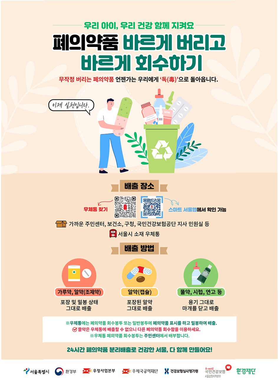 잘못 버린 약은 독이 됩니다. 종량제 봉투에 담아 버리거나 싱크대에 흘려보낼 경우, 약 성분이 토양과 하천으로 유입되어서 환경오염은 물론 생태계 교란까지 일으킬 수 있습니다. 폐의약품은 폐기물관리법상 ‘생활계 유해폐기물’로 분류됩니다. 분리배출 이후 소각을 원칙으로 합니다.
