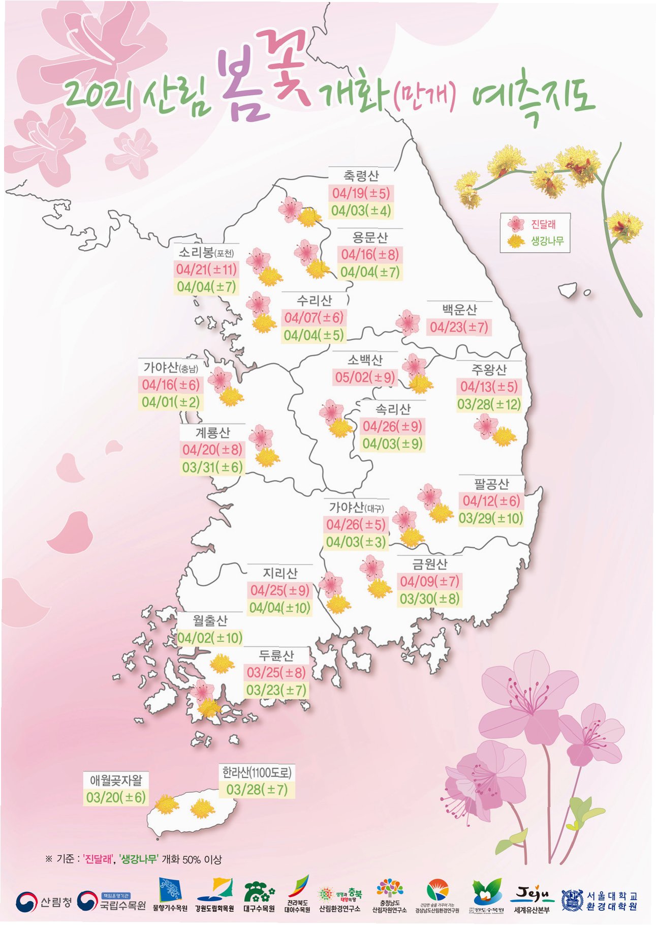 개나리는 서귀포에서 3월 14일, 서울에서는 3월 25일에 개화할 것으로 보입니다. 이는 평년보다 각각 이틀, 사흘 빠른 시기이며, 특히 서귀포는 지난해보다 무려 여드레나 빠릅니다. 진달래 역시 서귀포 3월 18일, 서울 3월 22일 개화가 예상되어, 기후 위기로 인한 평균 기온 상승이 꽃 피는 시기를 앞당기고 있음을 실감하게 합니다.