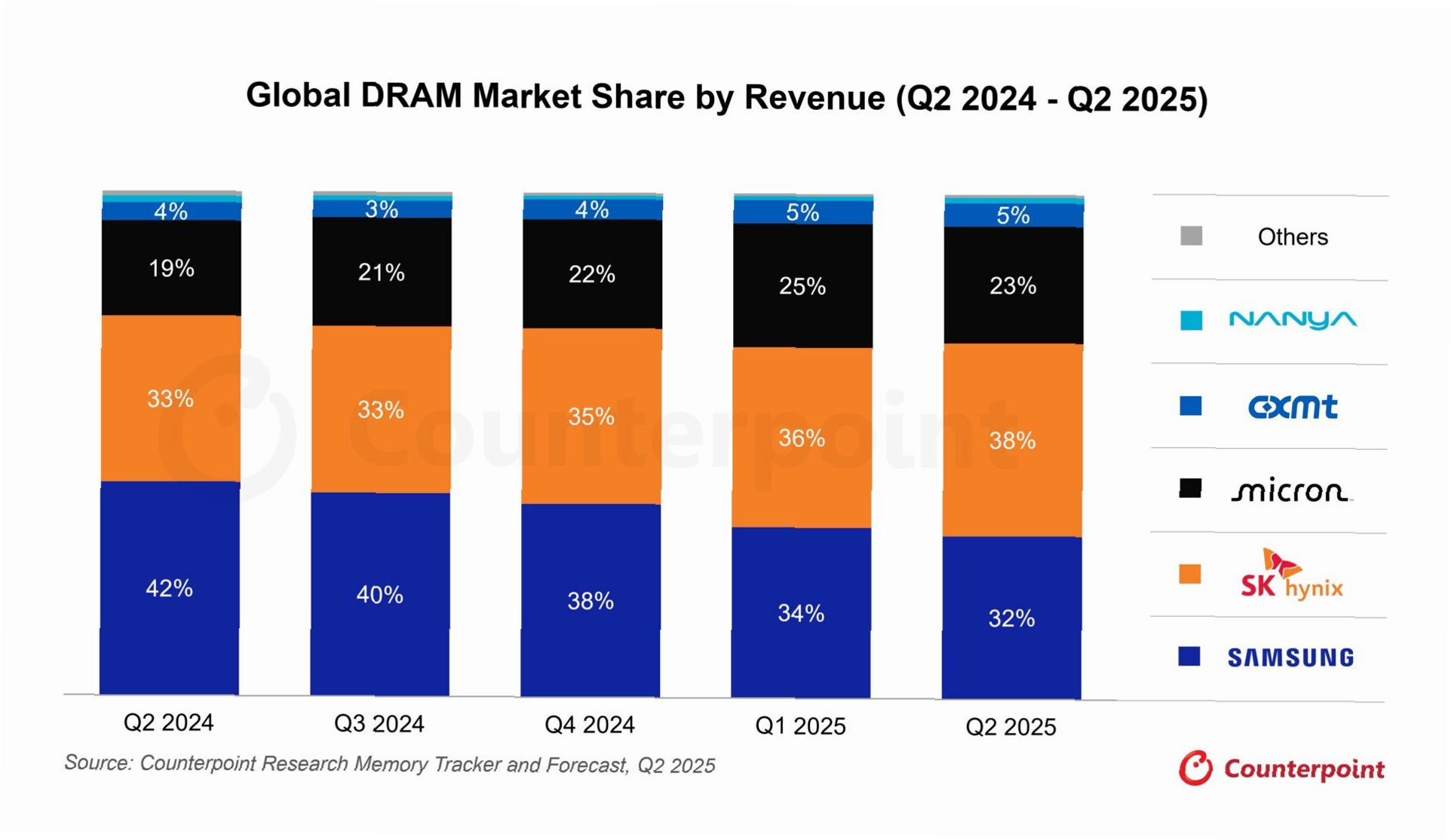 그간 삼성전자는 압도적인 생산능력을 바탕으로 D램 시장 점유율 1위를 굳건히 지켜왔습니다. 그러나 올해 1분기, SK하이닉스에 처음으로 선두 자리를 내주었습니다. 이는 고대역폭메모리(HBM) 등 고부가 제품에서 SK하이닉스가 괄목할 만한 성과를 거둔 데 기인합니다. 2~3분기 역시 SK하이닉스가 근소한 우위를 유지했습니다.