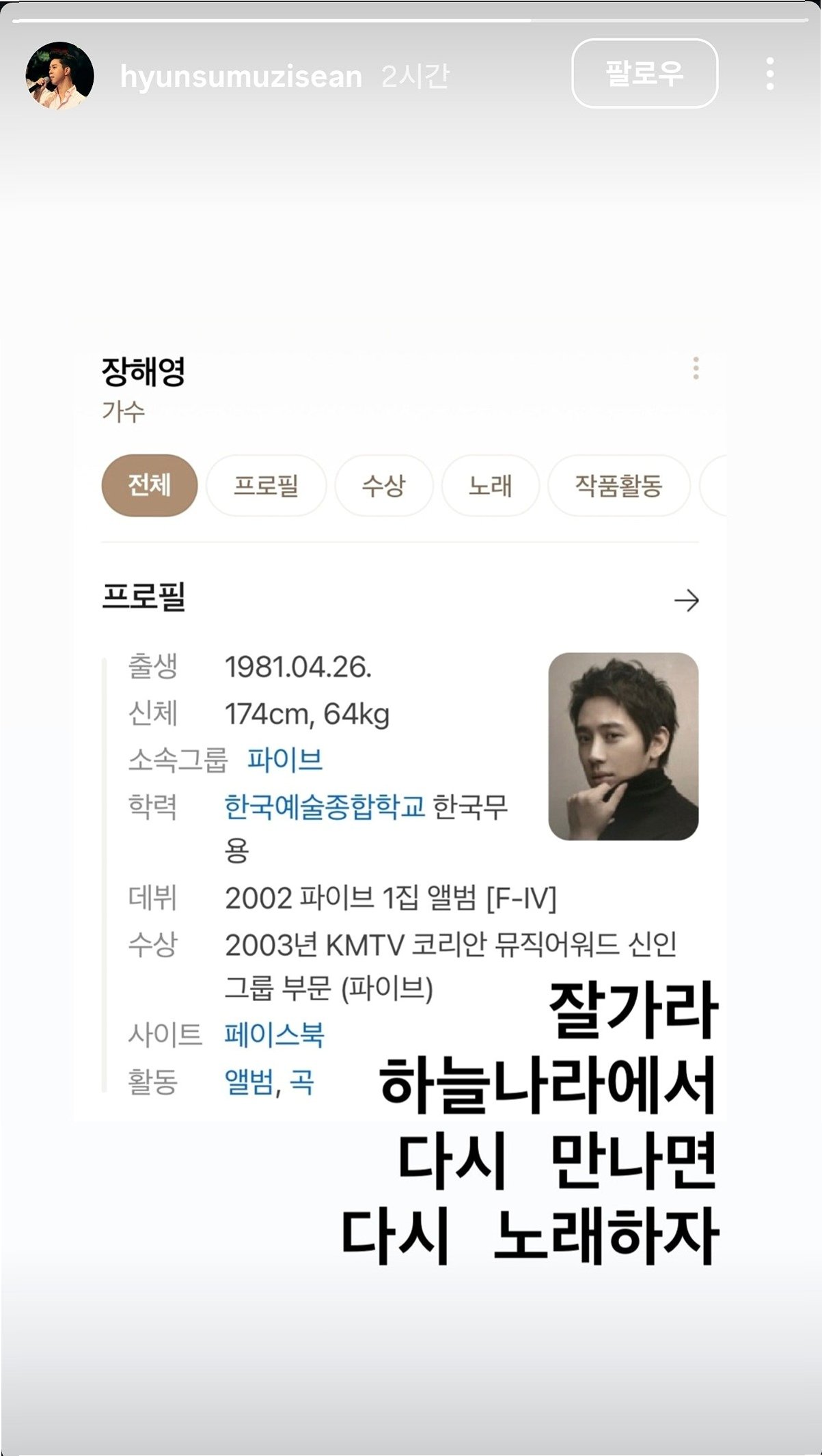파이브의 메인 보컬 장해영 님이 우리 곁을 떠났습니다. 그의 음악과 무대는 영원히 기억될 것이며, 팬들의 마음속에 그의 따뜻한 목소리는 영원히 남아 있을 것입니다.