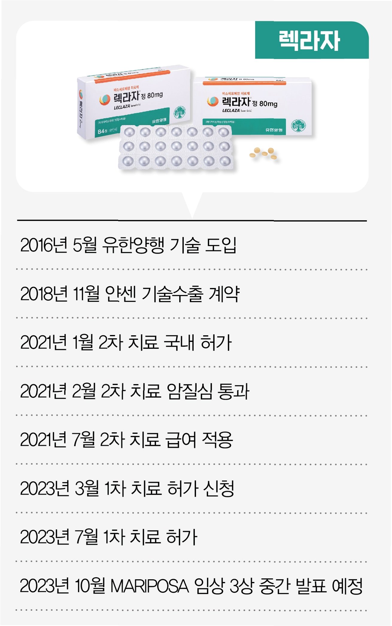 레이저티닙은 유한양행이 2015년 오스코텍으로부터 도입하여 2018년 J&J에 기술 이전(L/O, 계약 규모 9억 5000만 달러)한 신약입니다. J&J는 레이저티닙과 기존에 보유하고 있던 아미반타맙과의 병용 요법을 통해 글로벌 3상 임상을 진행하고 있으며, 2023년 8월에는 EGFRm NSCLC(변이 비소세포폐암) 1차 치료제로 FDA(미국 식품의약국) 승인을 받았습니다. 이 소식은 유한양행의 기술력과 레이저티닙의 잠재력을 전 세계적으로 인정받았음을 의미합니다.