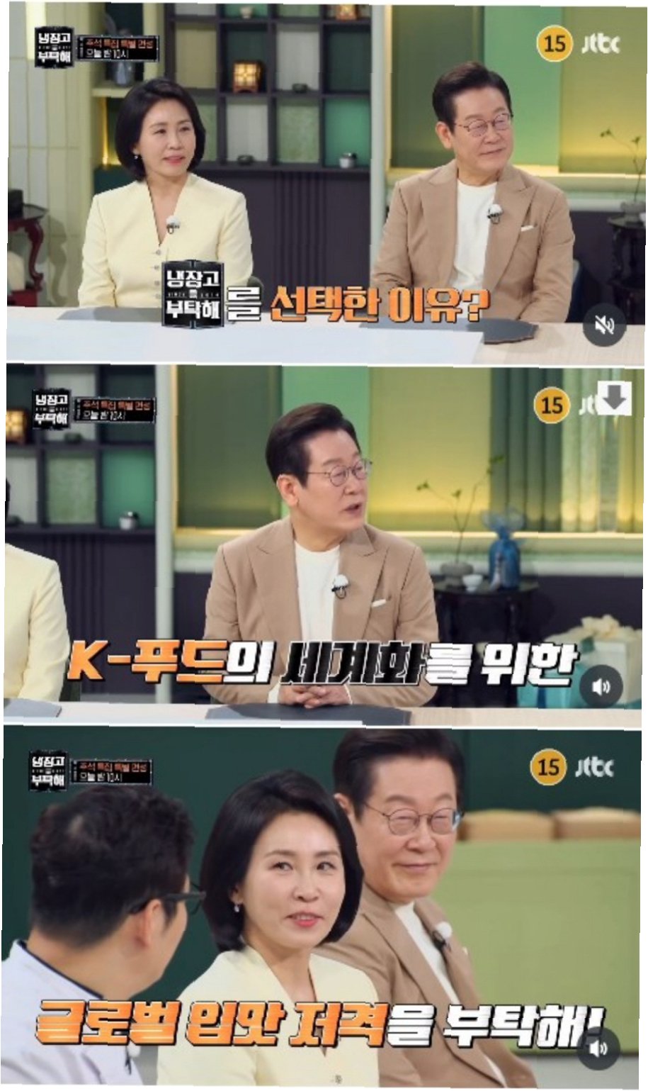 이재명 대통령 부부가 출연하는 '냉장고를 부탁해'(이하 '냉부해')가 마침내 오늘 방송을 시작합니다. JTBC에 따르면, 당초 예정되었던 추석 특집 '냉부해'는 대통령실의 요청에 따라 방영이 연기되었습니다. 이는 국가공무원의 사망으로 인한 추모 시간을 고려한 결정이었습니다이번 방송에서는 이재명 대통령 부부가 'K-푸드 전도사'로서 한국의 제철 농수산물과 전통 추석 음식을 소개할 예정입니다. 또한, 평소 즐겨 먹는 한식과 한가위와 관련된 옛 추억 등 진솔한 이야기를 나눌 것으로 알려져 시청자들의 기대를 모으고 있습니다.