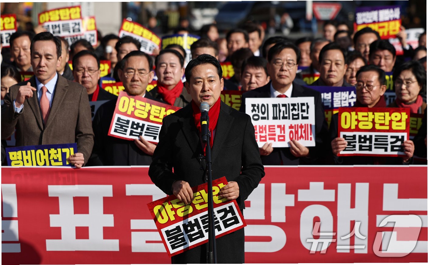 국민의힘 장동혁 대표가 추경호 의원의 구속을 막기 위해 '목숨을 걸고 지켜야 한다'며 강경한 입장을 표명했습니다. 2일 서울중앙지법 앞에서 열린 규탄대회에서 장 대표는 추 의원의 구속영장이 반드시 기각될 것이라고 강조하며, 이재명 정권의 독재를 끝내는 국민 대반격의 시작을 알렸습니다. 이는 단순한 정치적 발언을 넘어, 대한민국 법치와 자유민주주의의 운명이 걸린 중대한 사안임을 강조하는 것으로 풀이됩니다.