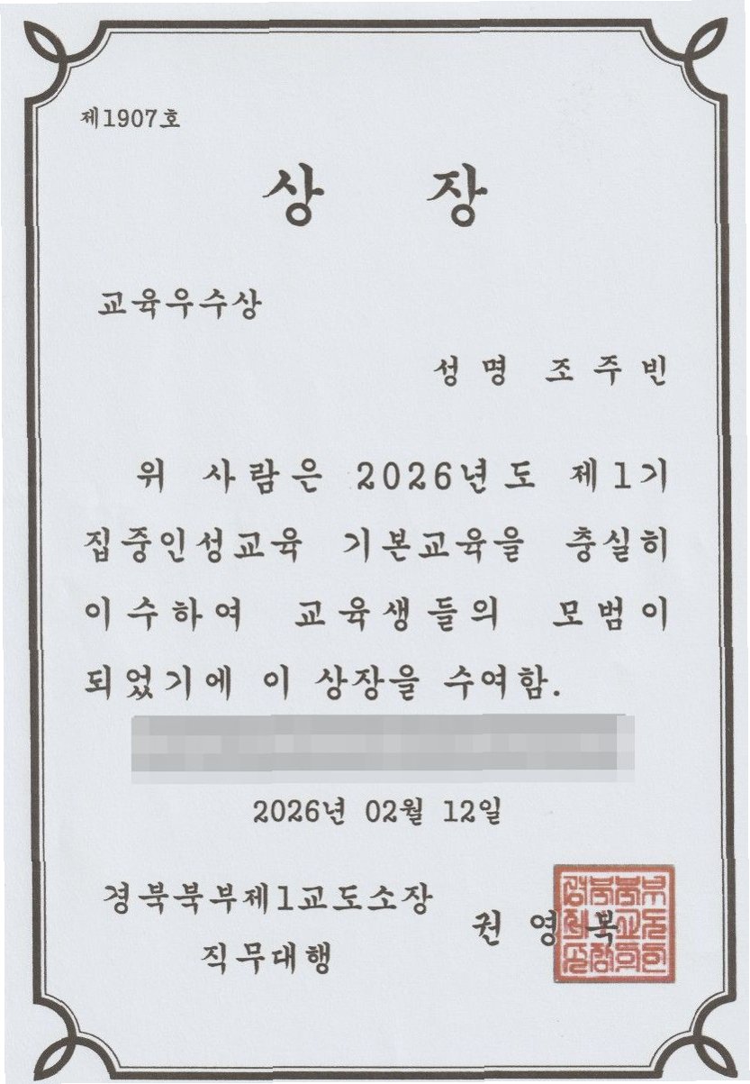 텔레그램 '박사방' 사건으로 징역 47년을 확정받고 복역 중인 조주빈이 경북북부제1교도소에서 '교육우수상'을 받았다고 주장하며 이를 블로그를 통해 공개했습니다. 그는 3주간의 교육 참여를 치하하는 상이라며, '제대로 된 상'이라고 표현했습니다. 조주빈은 학창 시절 상을 받아본 적이 없었다며, 이번 상이 노력의 결실이자 삶의 방향을 잡아주는 보물지도라고 강조했습니다. 교도소장 명의의 상장에는 집중인성교육을 우수하게 이수하고 모범이 된 점이 기재되어 있습니다.