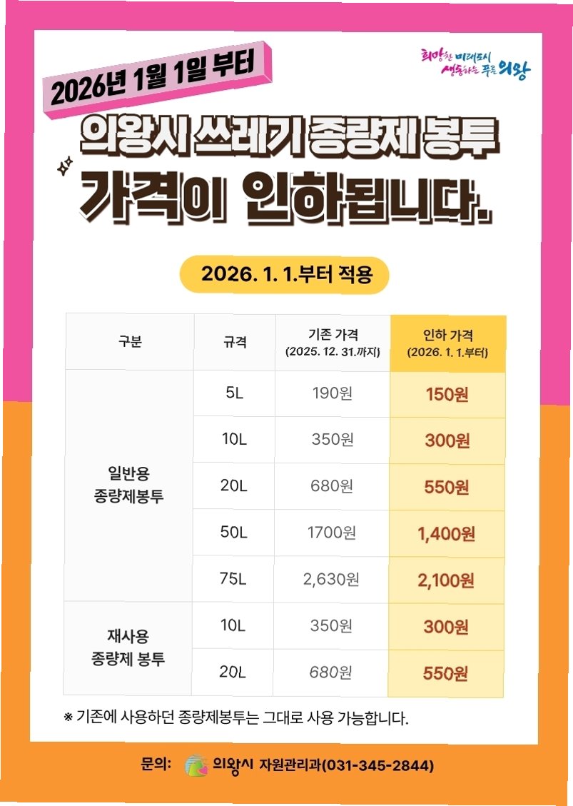 의정부시가 다음 달부터 쓰레기 종량제봉투 가격을 인하합니다. 20ℓ 봉투 기준 13.1% 인하되며, 안정적인 공급망 확보에도 만전을 기하고 있습니다. 하지만 사재기 현상 방지를 위해 과도한 구매는 자제해야 합니다.