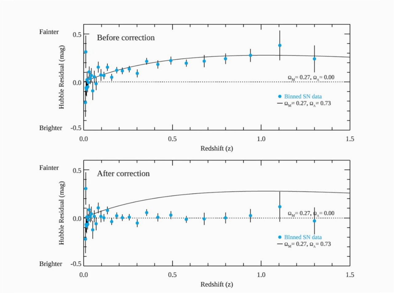 연구팀은 1a형 초신성의 밝기가 폭발을 일으킨 항성의 나이에 강하게 영향을 받는다는 사실을 밝혀냈습니다. 기존 연구에서는 1a형 초신성의 밝기가 일정하다고 가정하고, 이를 이용하여 우주의 거리를 측정했습니다. 하지만 이번 연구를 통해 1a형 초신성의 밝기가 항성의 나이에 따라 달라진다는 사실이 밝혀지면서, 기존의 거리 측정 방식에 대한 재검토가 불가피해졌습니다. 이는 우주 팽창에 대한 기존의 이론을 수정해야 할 필요성을 제기하며, 새로운 연구의 방향을 제시합니다.