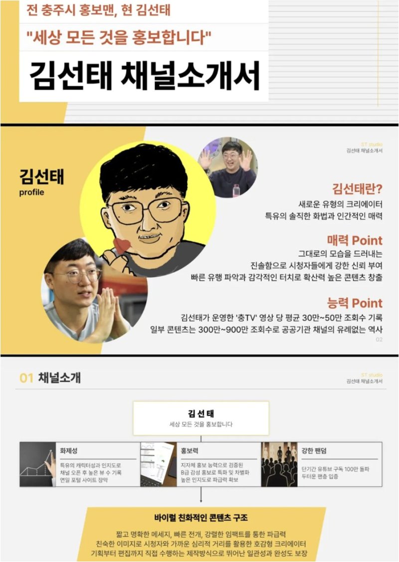 A.온라인 커뮤니티에 '김선태 채널소개서'라는 제목으로 퍼지고 있으나, 김 전 주무관 측이 직접 작성하고 배포한 자료인지는 공식적으로 확인되지 않았습니다.