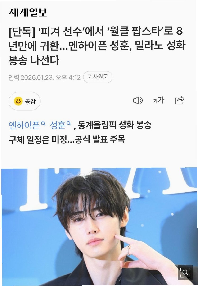 그룹 엔하이픈의 성훈이 2026 밀라노·코르티나담페초 동계올림픽 성화 봉송 주자로 참여하며 팬들의 뜨거운 관심을 받고 있습니다. 피겨 스케이팅 국가대표 상비군 출신인 성훈은 어린 시절 올림픽을 꿈꿨던 경험을 바탕으로, 이번 성화 봉송을 통해 스포츠에 대한 깊은 애정과 선수들을 향한 응원의 메시지를 전할 예정입니다. 삼성전자의 추천으로 참여하게 된 이번 행사는 그의 아이돌 활동뿐만 아니라 스포츠계에서도 영향력을 보여주는 계기가 될 것입니다. 엔하이픈으로서 활발한 활동을 이어가는 가운데, 성훈의 특별한 올림픽 여정이 더욱 기대를 모으고 있습니다.