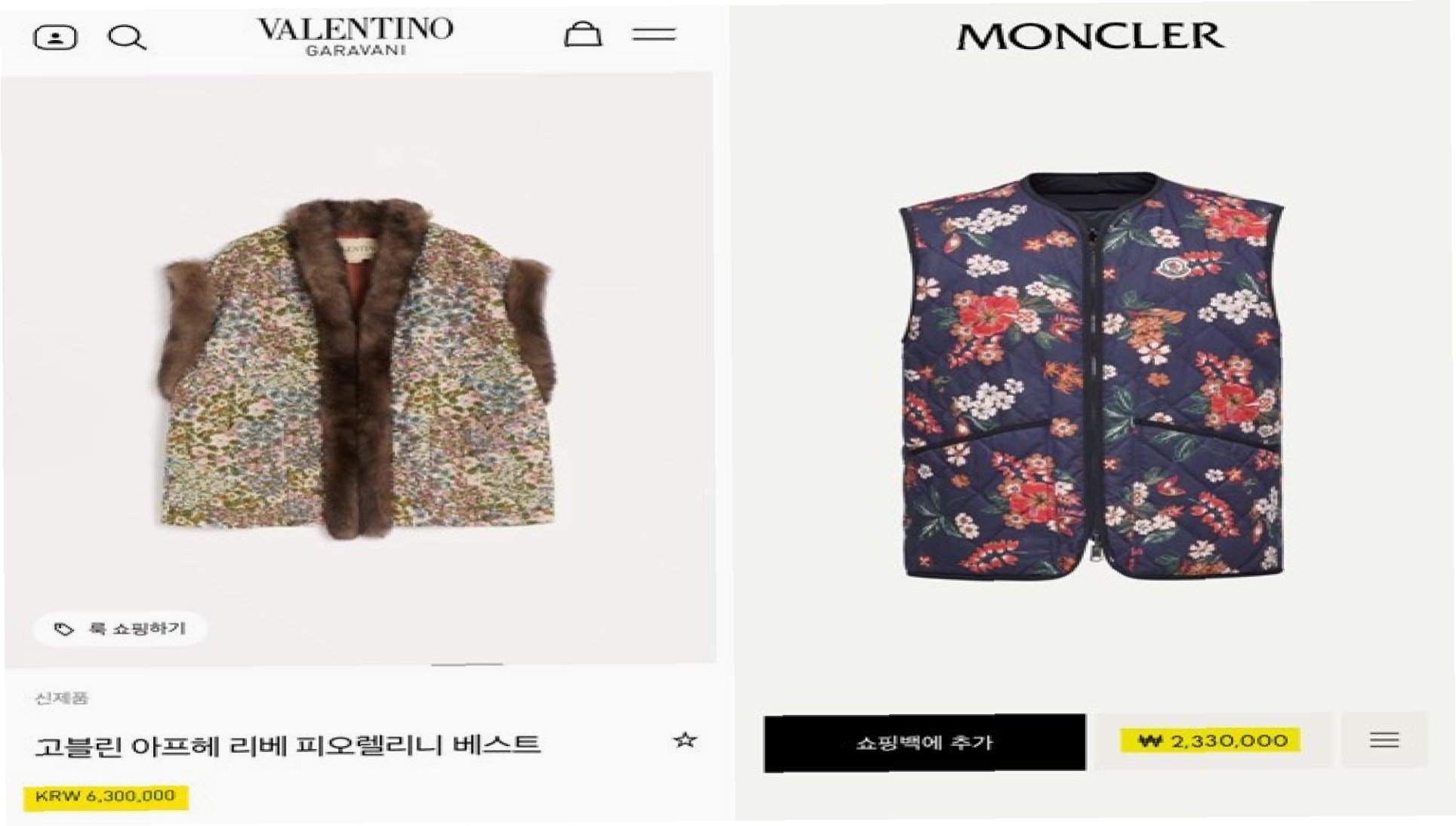 A.발렌티노의 여성용 조끼는 약 630만 원, 남성용 조끼는 300만 원대에 출시되었으며, 몽클레어의 다운 베스트는 230만 원대에 선보였습니다.