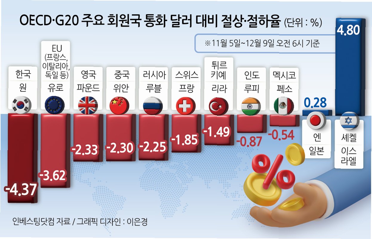 최근 원·달러 환율이 심상치 않은 움직임을 보이며, 많은 이들의 불안감을 자아내고 있습니다. 12월 평균 환율이 1470원을 넘어 외환 위기 이후 최고치를 기록했다는 소식은 결코 가볍게 넘길 수 없는 문제입니다. 이는 단순한 숫자의 문제가 아니라, 우리 경제 전반에 걸쳐 심각한 영향을 미칠 수 있는 신호탄입니다. 특히, 달러가 약세 기조를 보이는 글로벌 시장 상황과 정반대로 원화 가치만 하락하고 있다는 점은 더욱 우려스러운 부분입니다. 이러한 엇박자 현상은 국내 경제의 취약성을 드러내는 동시에, 앞으로 우리가 마주해야 할 과제들을 시사합니다. 지금부터 원화 가치 하락의 원인과 향후 전망에 대해 자세히 알아보겠습니다.
