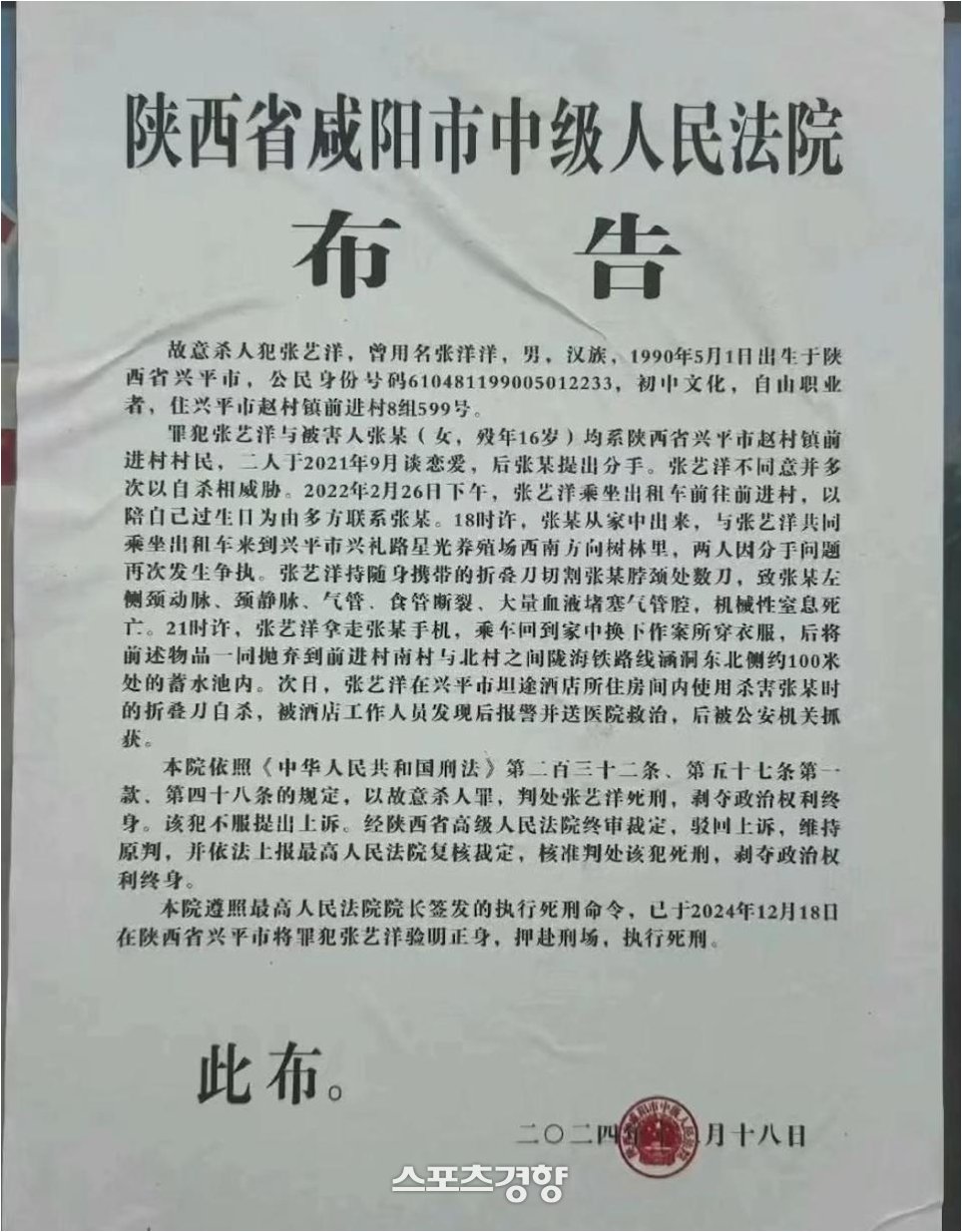 사건 발생 이후 장이양은 극단적인 선택을 시도했지만, 실패로 돌아갔습니다. 체포 후 조사 과정에서 그는 2019년부터 A씨를 지속적으로 협박하며 통제해왔다는 사실이 밝혀졌습니다. 특히, 사망 당시 A씨는 만 16세로, 장이양과는 15살의 나이 차이가 났다는 점이 더욱 큰 충격을 안겼습니다. 재판부는 그의 범행 동기가 악질적이고 수법이 잔혹하며 반성의 기미가 전혀 없다고 판단, 사형을 선고했습니다. 장이양은 이에 항소했지만, 항소심과 최고인민법원에서도 원심이 확정되었습니다.