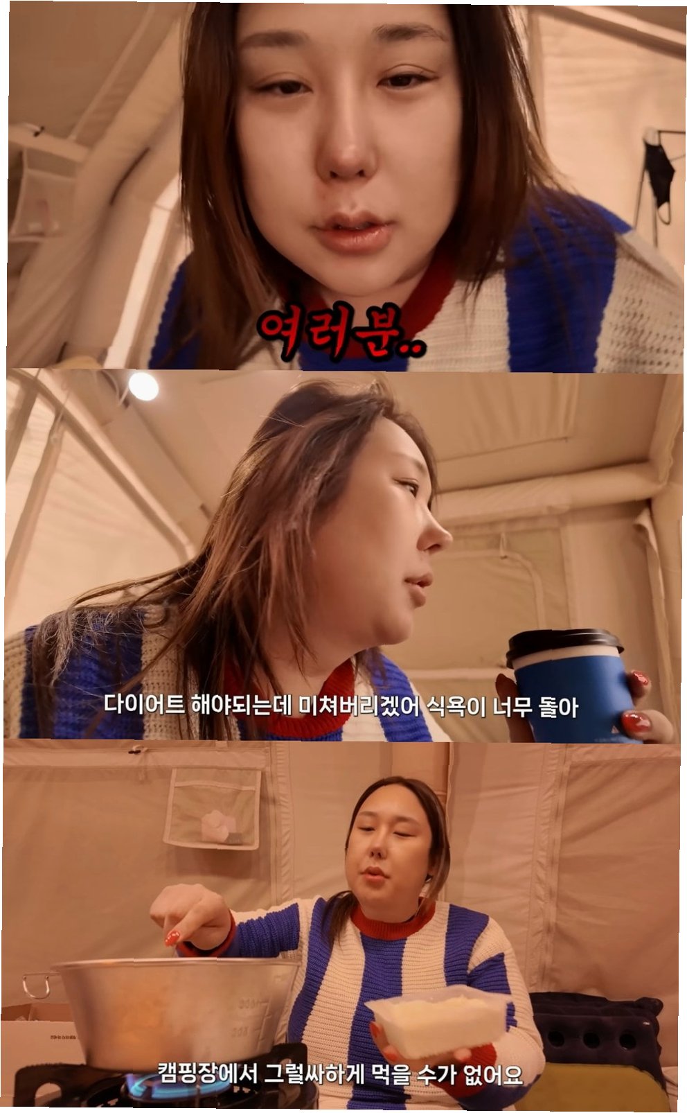방송인 풍자가 최근 겨울 캠핑 중 다이어트 중 겪는 어려움을 솔직하게 털어놓았습니다. 영하 18도의 추운 날씨 속에서도 캠핑을 즐기며 직화구이 생선, 된장찌개, 머루주 등 다양한 음식을 맛보았지만, 이후 급증하는 식욕 때문에 고통을 호소했습니다. 풍자는 '다이어트해야 하는데, 식욕이 너무 돌아서 미쳐버리겠다'며, 일어나자마자 배고픔을 느끼고 라면과 빵까지 섭취하는 등 식욕 조절의 어려움을 드러냈습니다.