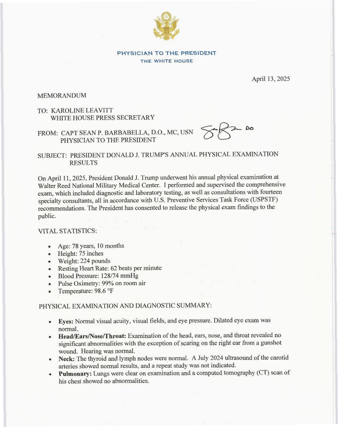 트럼프, 건강검진 결과 공개: 79세에도 '탁월한 건강'
