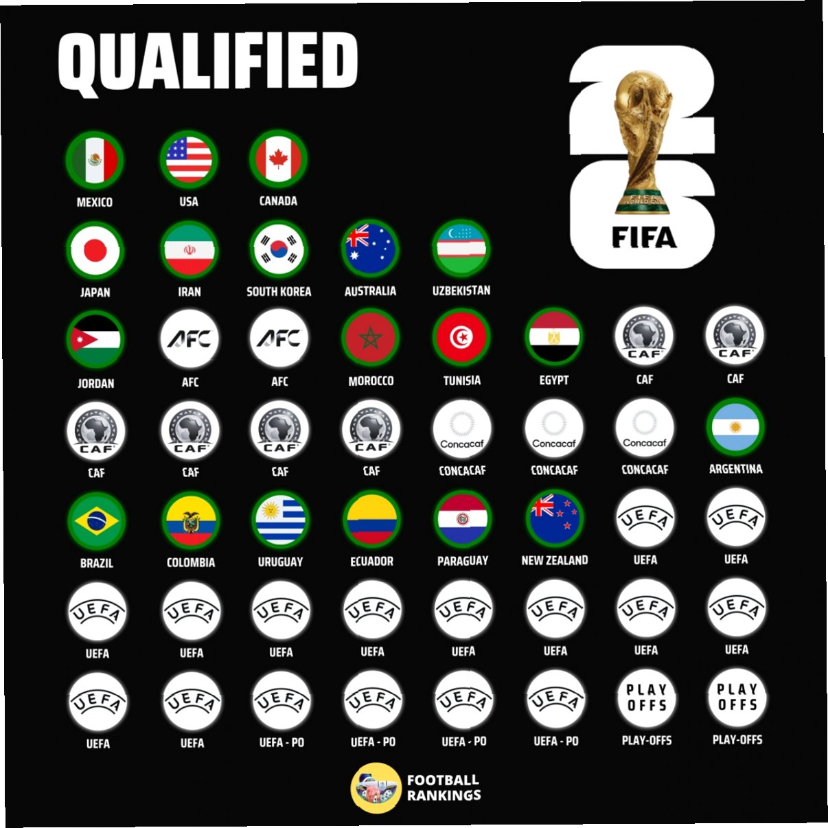 이집트의 본선 진출 확정으로 2026 북중미 월드컵 본선 진출을 확정한 국가는 총 19개국으로 늘어났습니다. 개최국인 멕시코, 미국, 캐나다를 비롯하여 아시아에서는 대한민국, 일본, 이란, 호주, 요르단, 우즈베키스탄이 본선 진출을 확정했습니다. 아프리카에서는 모로코, 튀니지, 이집트가, 남미에서는 아르헨티나, 브라질, 에콰도르, 우루과이, 콜롬비아, 파라과이가, 오세아니아에서는 뉴질랜드가 본선행을 확정했습니다. 남은 29장의 티켓을 놓고 치열한 경쟁이 예상됩니다.