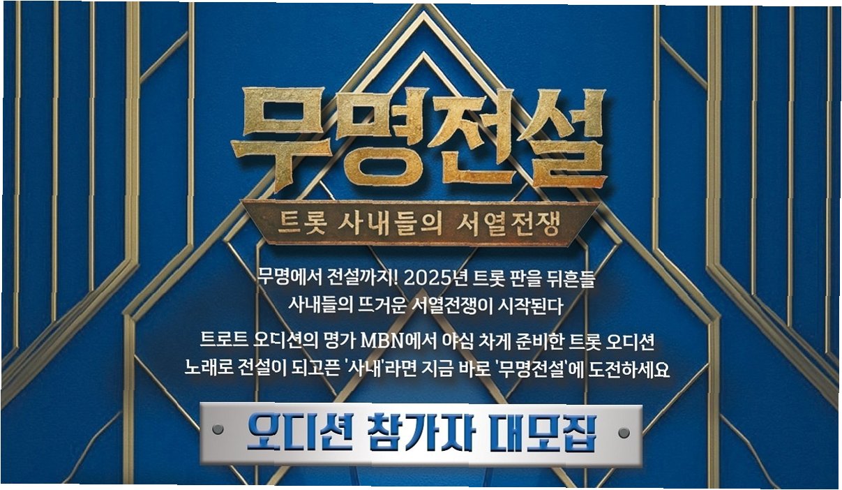 MBN의 '무명전설'은 남진, 조항조, 주현미 등 트로트 거장들의 참여와 파격적인 우승 특전, 그리고 숨겨진 참가자들의 등장으로 트로트 서바이벌의 새로운 역사를 예고합니다. 다음 달 25일 첫 방송을 통해 '무명전설'의 화려한 서막이 펼쳐질 예정입니다.