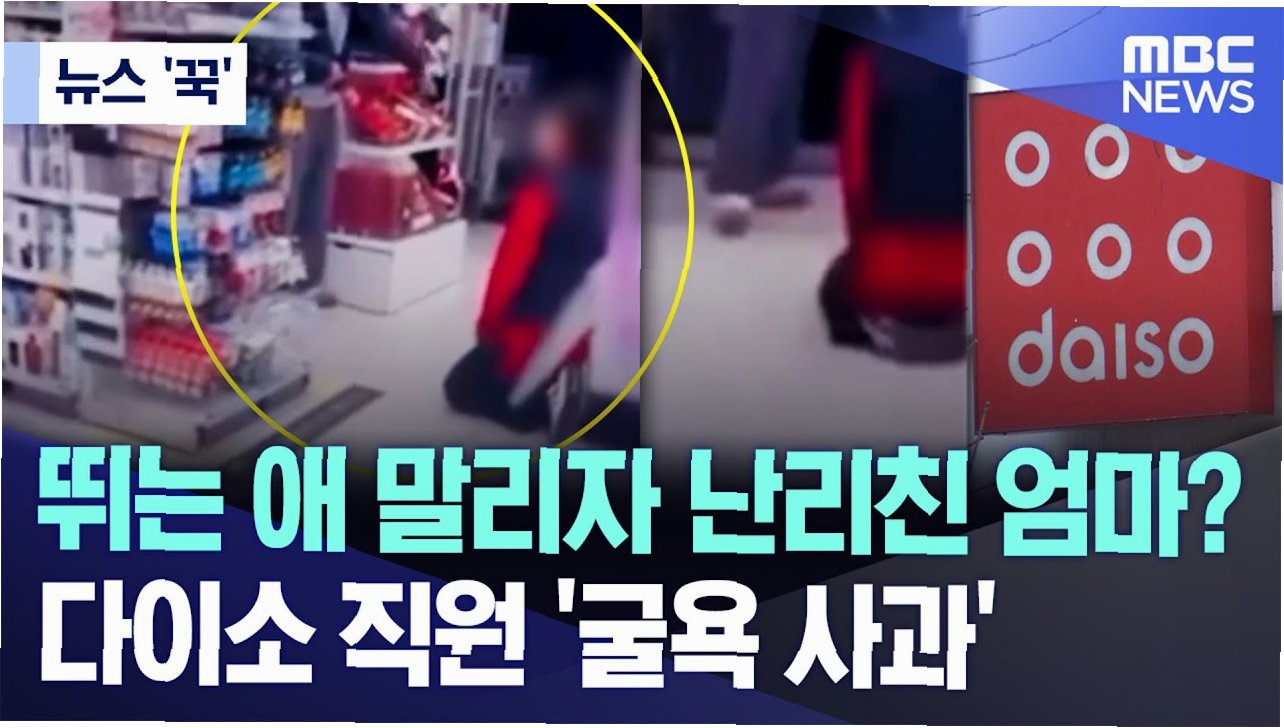 A.다이소 매장에서 아이의 안전을 위해 직원이 주의를 주었으나, 아이 엄마가 이에 격분하여 직원에게 폭언을 하고 무릎을 꿇게 만든 사건입니다.