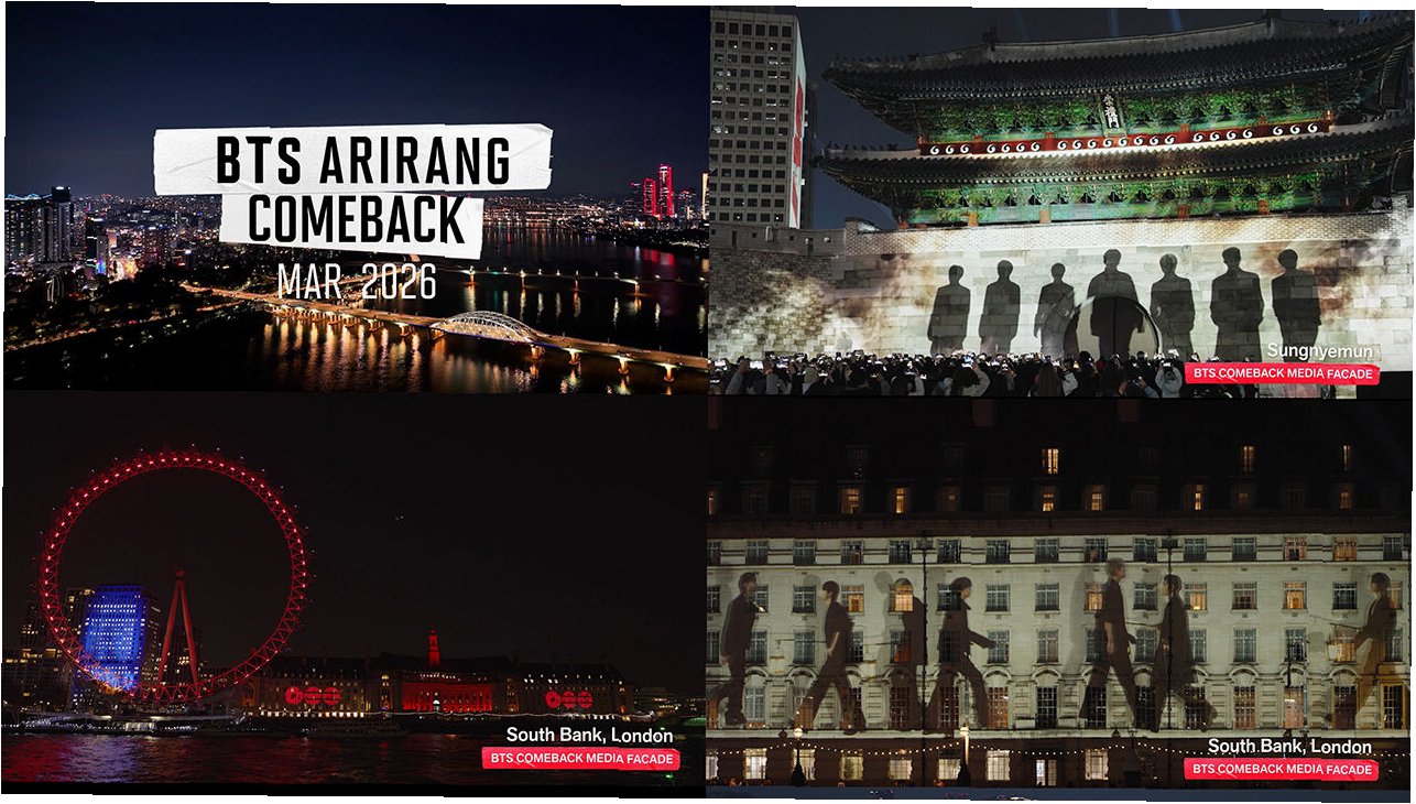 방탄소년단의 컴백을 기념한 ‘BTS THE CITY ARIRANG’ 프로젝트는 런던, 뉴욕, 서울의 랜드마크를 활용한 미디어 아트와 드론 쇼, 시민 참여형 이벤트로 전 세계적인 축제를 만들었습니다. 이는 단순한 컴백을 넘어 도시 전체를 문화 공간으로 확장시킨 성공적인 사례로 평가받고 있습니다.
