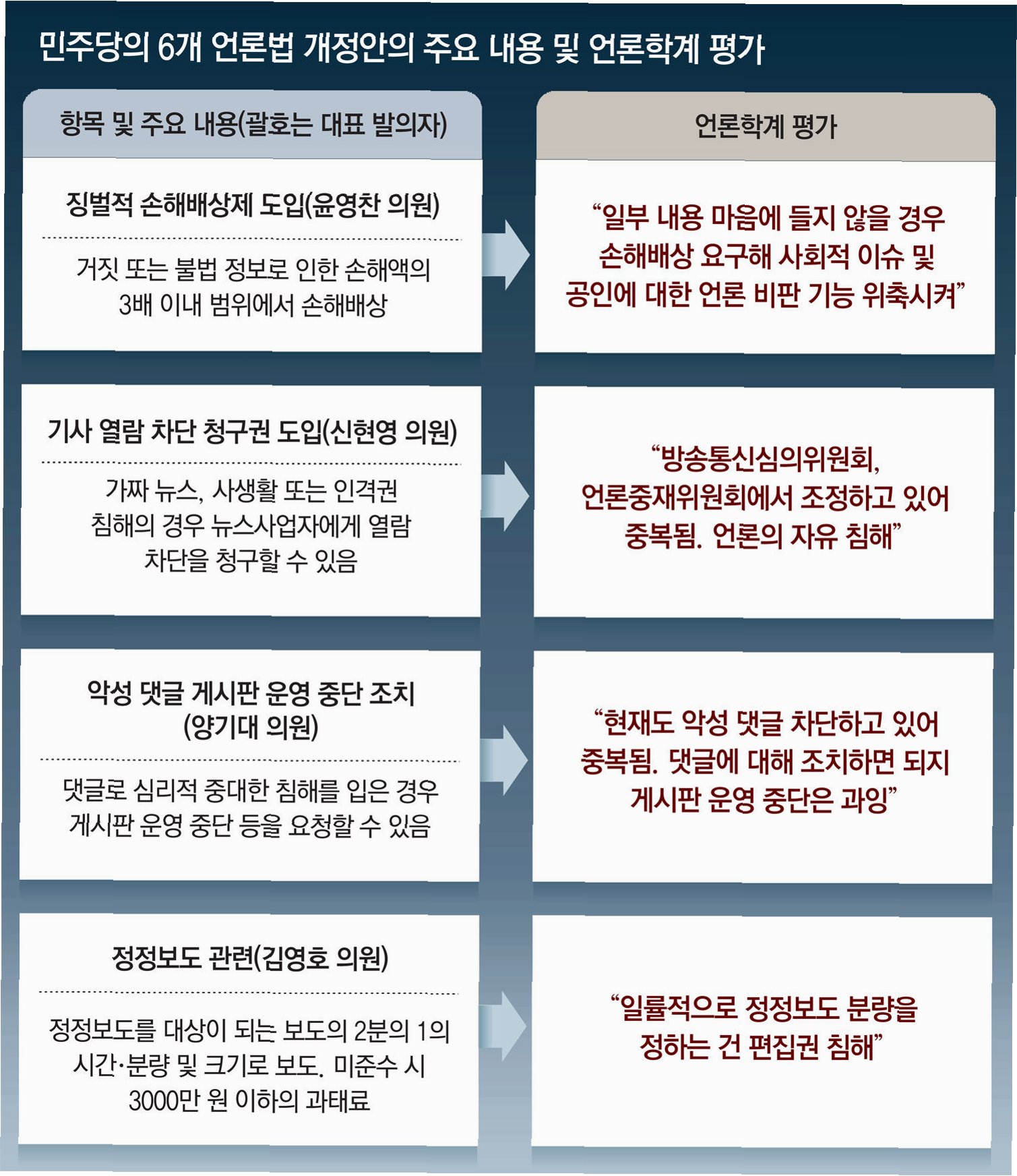 법안 찬성 측은 허위 정보로 인한 피해를 막고, 사회적 혼란을 방지해야 한다고 주장합니다. 특히, 온라인 플랫폼에서 확산되는 허위 정보로 인해 개인과 사회가 입는 피해가 심각하다는 점을 강조합니다. 반면, 야당과 언론 시민단체는 법안이 표현의 자유를 위축시키고, 언론의 기능을 저해할 수 있다고 우려합니다. 특히, 징벌적 손해배상 제도가 언론의 자유로운 비판 활동을 위축시키고, 권력 감시 기능을 약화시킬 수 있다는 점을 지적합니다. 참여연대는 ‘언론 기능 위축, 졸속 입법’이라며 강하게 비판했습니다.