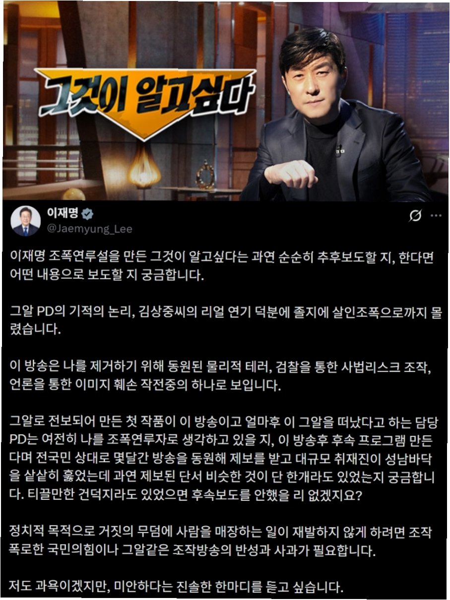 이 대통령은 '그알' 제작진이 사과해야 할 대상은 정치인 이재명보다, 조작 보도로 인해 잘못된 선택을 하거나 반대의 선택을 강요당한 대한민국 주권자들이라고 밝혔습니다. 특히 '방송에 속아 다른 선택을 하고 가슴 아파하는 분들'에게 직접적인 메시지를 전달하며, 억울함과 후회에 가슴 치는 국민들에게 위로를 전했습니다.