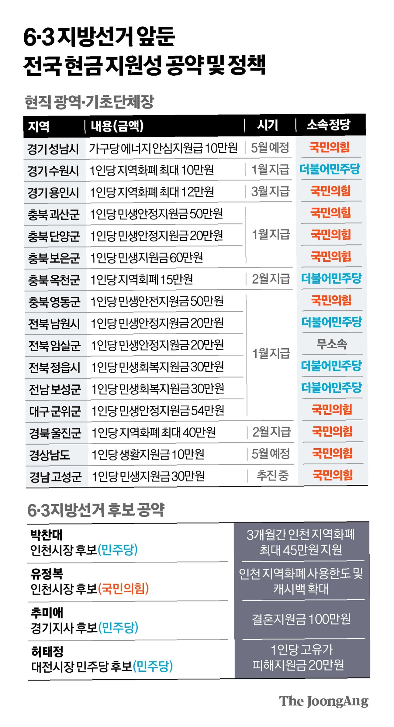 고유가 지원금을 '현금 살포성 예산'이라 비판했던 국민의힘 소속 단체장들도 경쟁적으로 현금성 지원에 나서고 있습니다. 박완수 경남지사는 도민 생활금 10만원 지급을 발표했으며, 신상진 성남시장과 이상일 용인시장도 각각 에너지 지원금과 지역 화폐 지급을 약속했습니다. 민주당 소속 단체장들 역시 맞불을 놓으며 득표 경쟁에 뛰어들고 있습니다. 허태정 대전시장 후보는 20만원, 박찬대 인천시장 후보는 최대 45만원, 추미애 경기지사 후보는 100만원의 결혼 지원금을 공약했습니다.