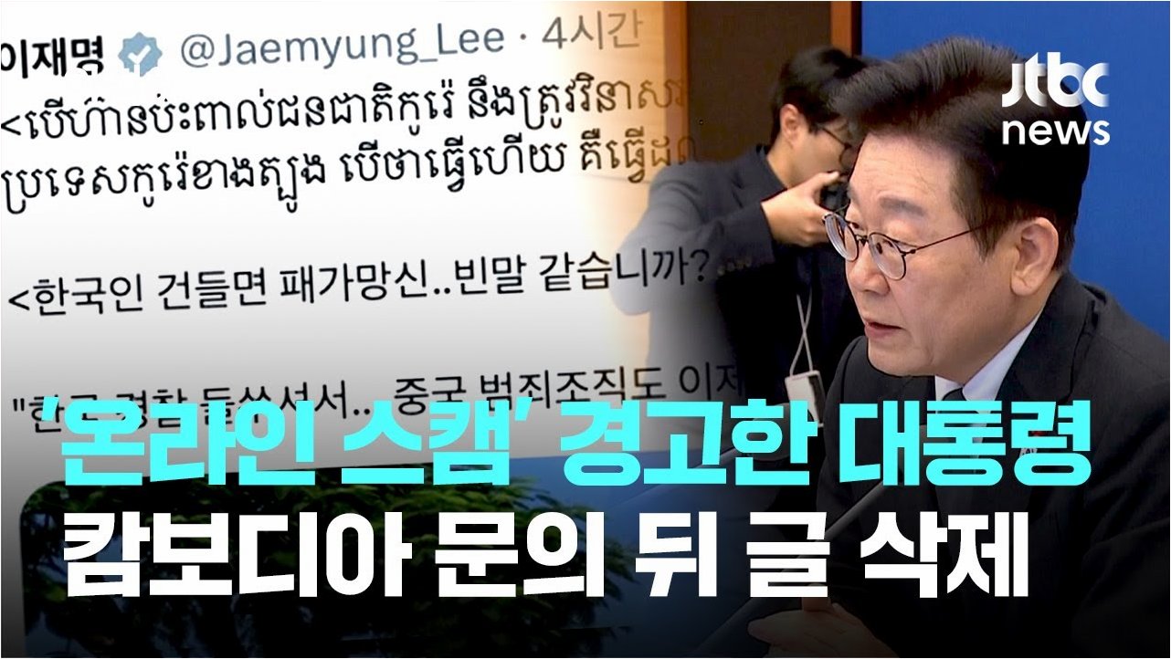 이재명 대통령이 캄보디아 현지에서 한국인을 대상으로 범죄를 저지르는 조직들에게 캄보디아어(크메르어)로 경고 메시지를 보냈다가 캄보디아 외교부의 문의를 받고 해당 게시물을 삭제하는 일이 발생했습니다. 지난달 30일, 이 대통령은 SNS에 '캄보디아 현지 중국 범죄조직도 이제는 한국 경찰의 단속이 두려워 한국인 조직원을 모집하지 않는다'는 취지의 기사를 공유하며 '한국인을 건들면 패가망신, 빈말 같습니까'라는 글을 게시했습니다. 이 글은 크메르어로도 번역되어 올라왔습니다.
