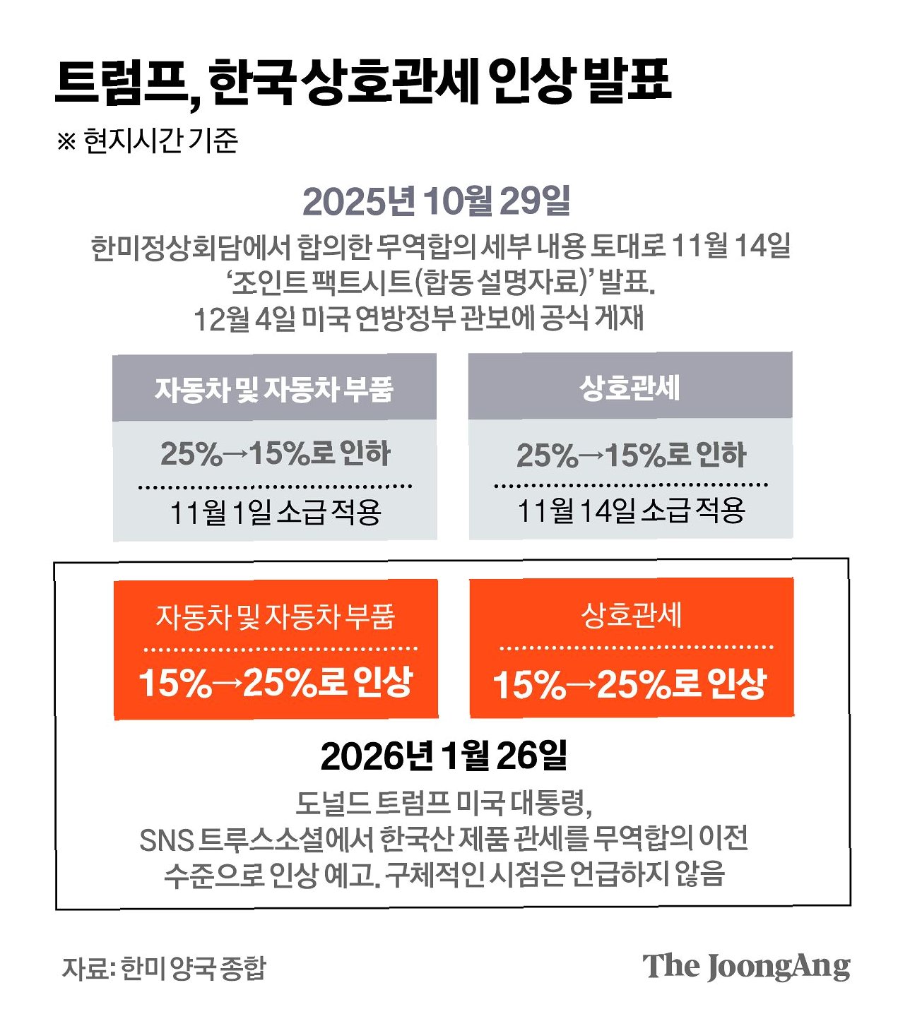 트럼프 대통령은 관세 인상 발효 시점이나 추가 조치에 대한 언급을 하지 않았습니다. 이는 한국과의 협상 가능성을 열어둔 것으로 보입니다. 지난해 11월 체결된 '한미 전략적 투자에 관한 양해각서(MOU)'에 따라 한국 국회에 법안이 제출되면 관세 인하 조치가 소급 적용될 예정이었으나, 대미투자특별법의 국회 통과가 지연되고 있는 상황입니다.