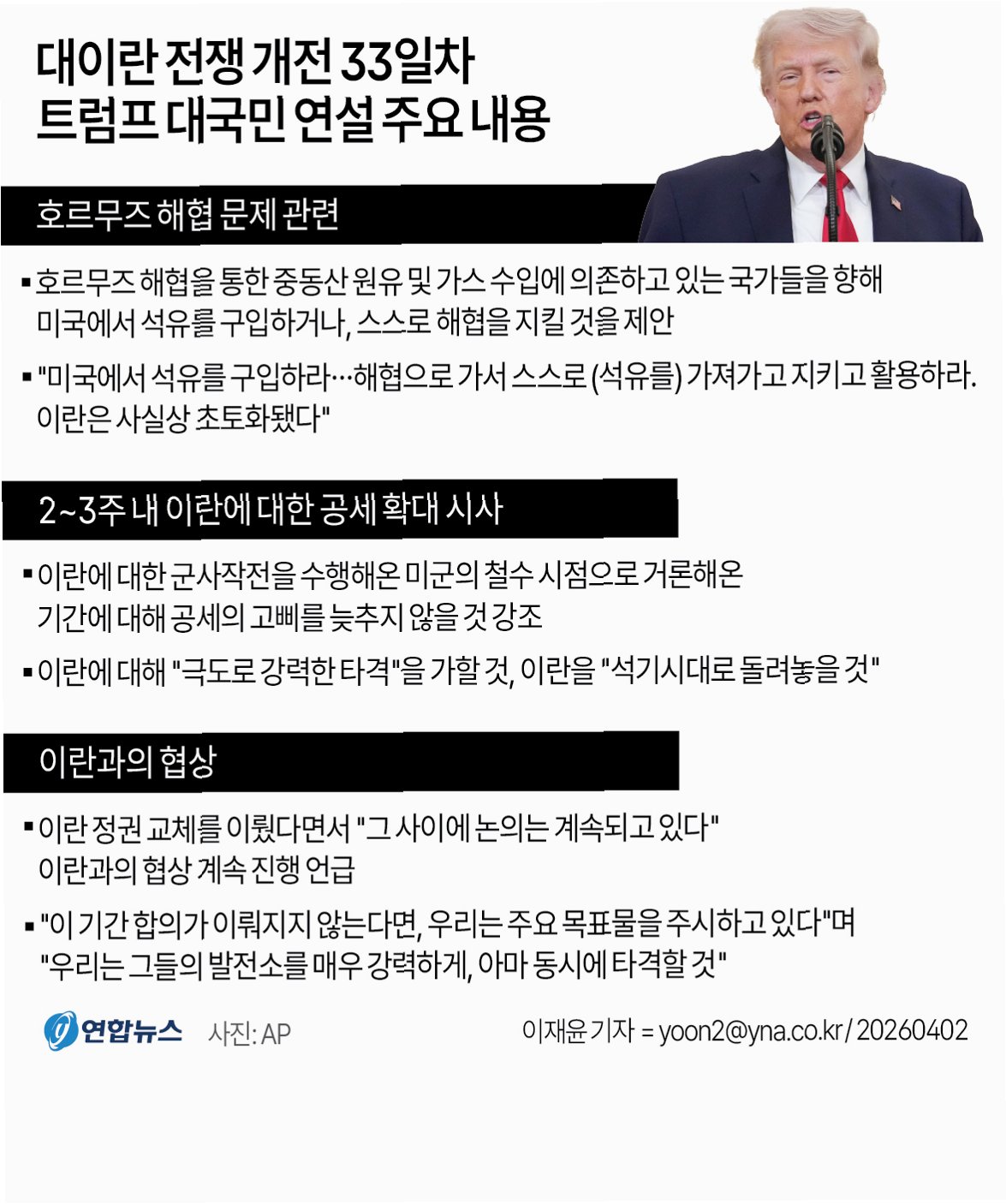 트럼프 대통령은 이란의 군사적 능력을 무력화하고 핵 개발을 저지하겠다는 강력한 의지를 표명했습니다. 호르무즈 해협 문제에 대한 책임은 이용 국가에 있으며, 미국산 원유 수입을 통해 에너지 시장의 안정을 꾀할 것을 제안했습니다. 이는 이란에 대한 압박을 강화하고 세계 경제의 안정을 도모하려는 다각적인 전략입니다.