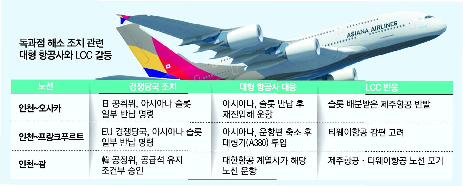 아시아나항공은 일본 공정취인위원회(JFTC)의 독과점 방지 조치에 따라 인천~오사카 왕복 운항권을 반납했습니다. 하지만 이후 자체적으로 새로운 슬롯을 확보하여 운항을 재개했습니다. 일본 노선은 항공자유화지역으로 지정되어 있어, 슬롯 확보를 통해 비교적 자유롭게 운항이 가능하기 때문입니다.
