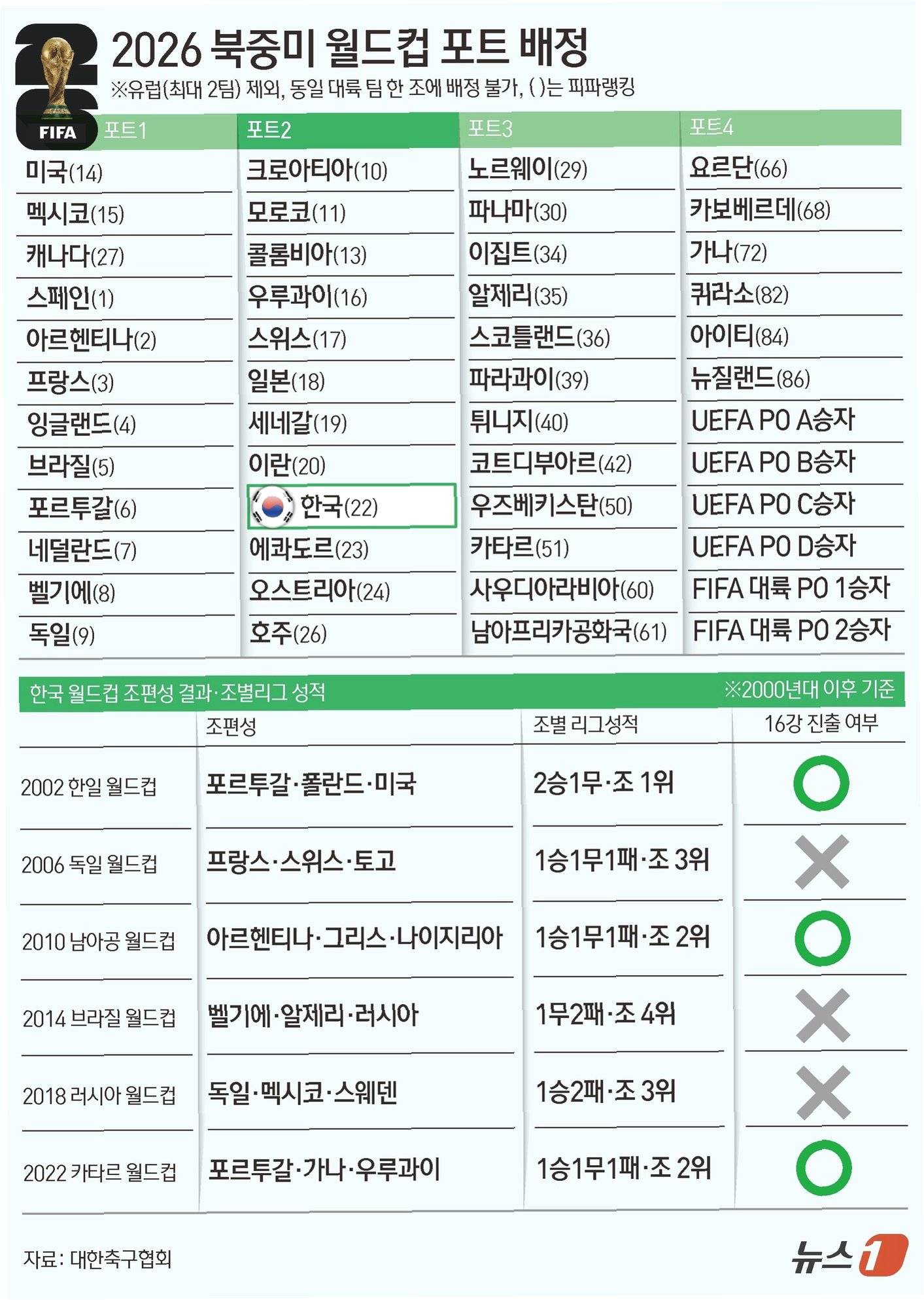 A.B조에 캐나다, 스위스, 카타르, 유럽PO 승자 등이 포진해 있어 한국이 조 2위로 32강에 오를 경우, 만나는 상대가 브라질이나 프랑스가 아닌 스위스나 캐나다 정도가 될 가능성이 높아 16강 진출 가능성이 높게 점쳐집니다.