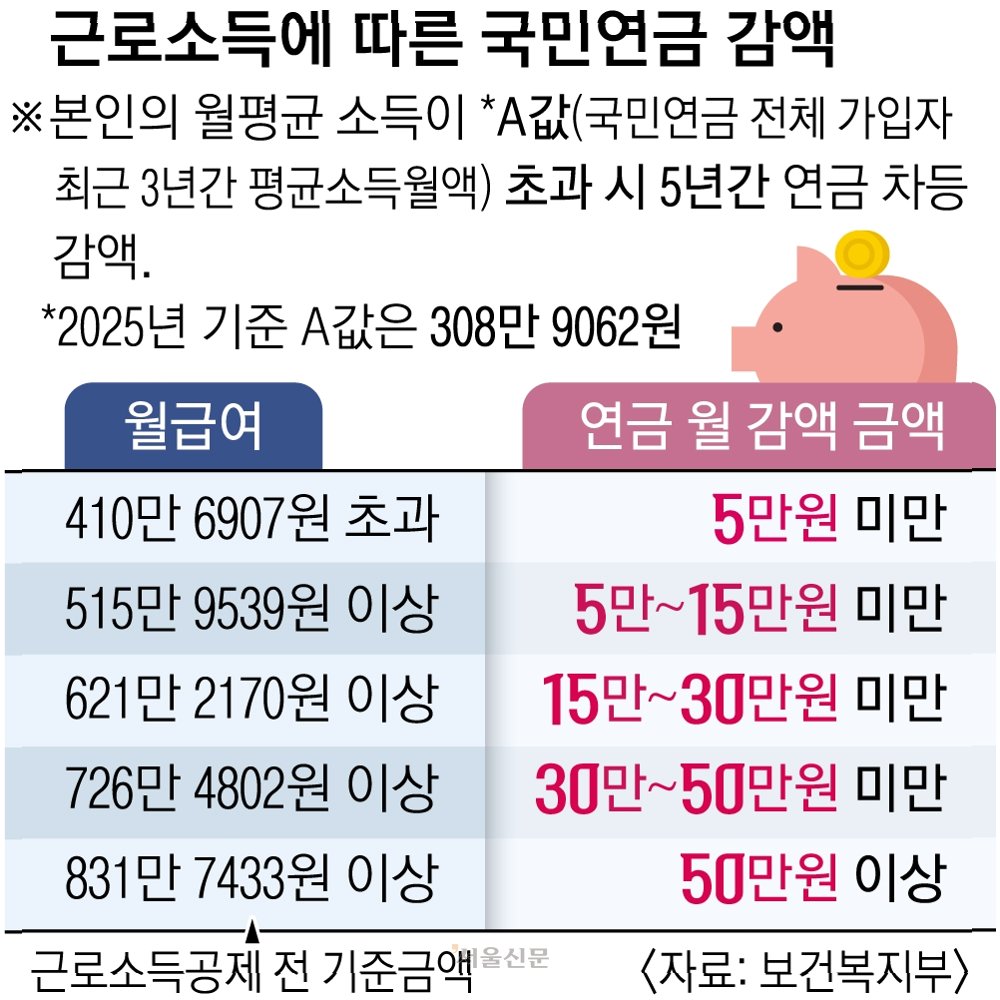 정부는 고령자 고용 확대를 외치고 있지만 정작 국민연금 제도 내에는 '소득 활동에 따른 노령연금 감액제도'가 존재합니다. 연금 수급자가 일정 기준(2025년 기준 월 308만 원) 이상의 소득을 올리면 연금액을 최대 50%까지 깎는 제도입니다. 이는 "일하면 손해"라는 인식을 심어줘 근로 의욕을 꺾을 수 있다는 비판을 받아왔습니다.